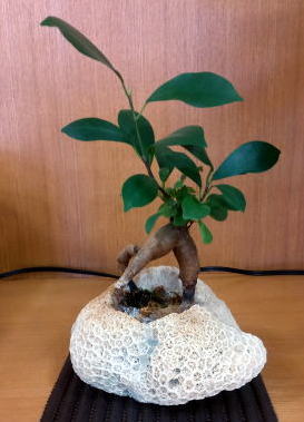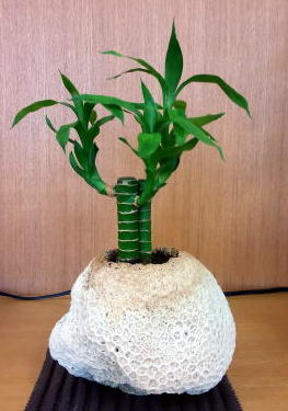 海岸に漂着しているサンゴで制作した植木鉢です。左:ガジュマルと右:ドラセナ(ミリオンバンブー)は100円均一で販売されているものです。